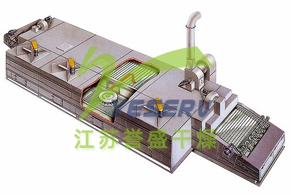料斗中的物料由加料器均匀的铺在不锈钢丝网上,由传动电机带动网带在干燥箱内匀速移动。干燥段由若干单元组成,热风在两个( 或几个) 单元内纵向循环,新鲜空气由风机进入,通过换热器加热,热空气穿过物料层与物料热交换,进入下腔,然后流向下一单元,降温后的热空气再经换热器进行二次加热,热空气穿透网带与物料再次热交换,湿热空气由排湿风机排出,完成干燥,每台干燥机单元数可根据物料的特性、工艺要求选取。